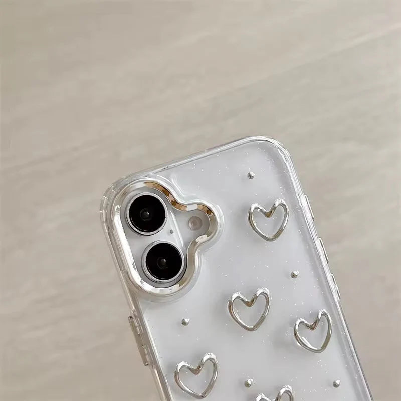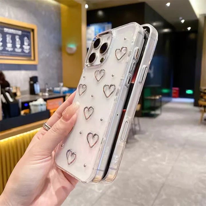 3D Glitter Silver Heart Transparent Case for iPhone